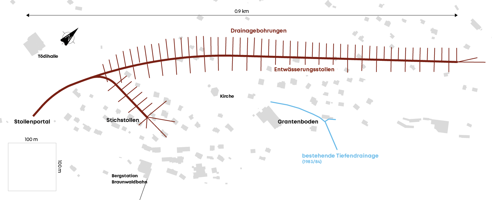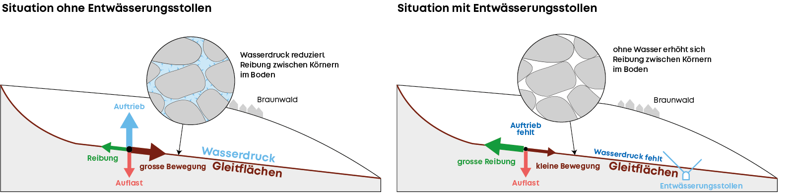 Der Boden in Braunwald ist in Bewegung und rutscht über tieferliegende Gesteinsschichten langsam talwärts. Mit der Entwässerung des Erdreichs wird die Bewegung massgeblich eingedämmt. Damit sollen Schäden an Gebäuden und Infrastruktur in Braunwald und in den darunterliegenden Gebieten im Tal künftig verhindert werden.