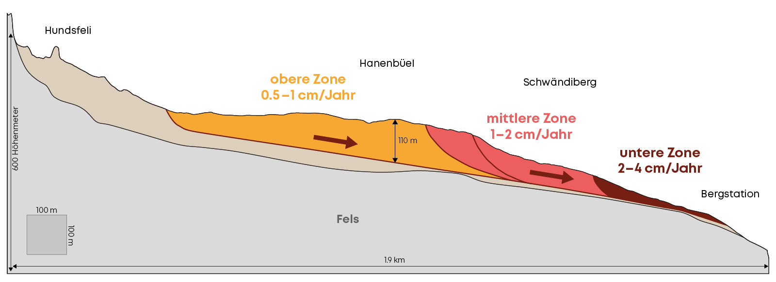 Das orange/rot gefärbte Gelände rutscht je nach Zone und Jahreszeit unterschiedlich schnell, im Durchschnitt zwischen 0.5 und 4 Zentimetern pro Jahr. Das sich bewegende Erdreich, welches über dem stabilen Fels liegt, ist zwischen 20 und 110 Metern dick.