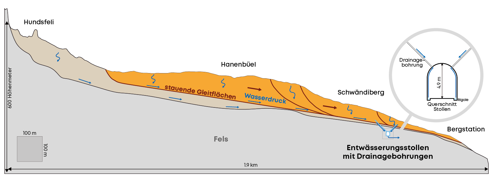 Das Wasser im Erdreich wird gefasst und in den Stollen abgeleitet. Somit wird der Rutscheffekt deutlich vermindert.